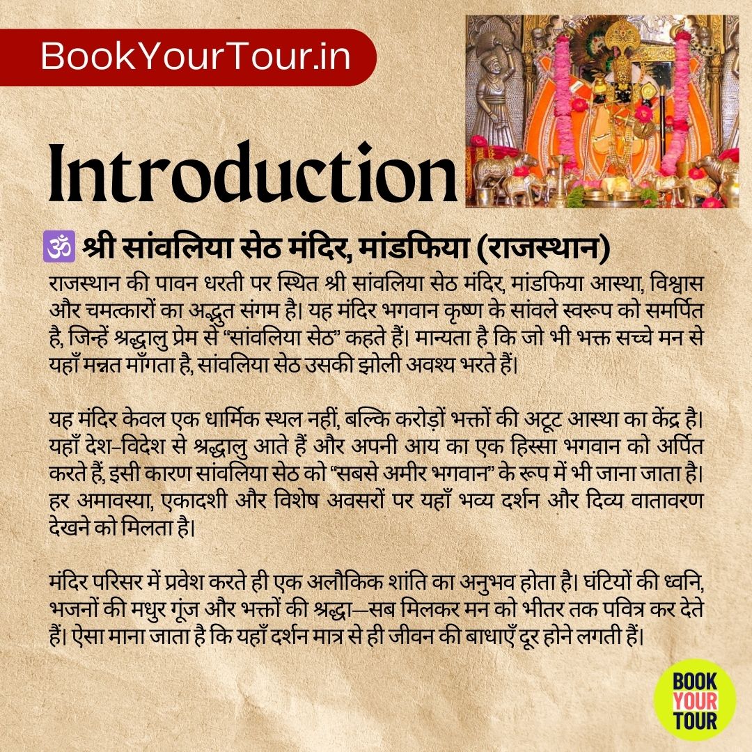 अपनी श्रद्धा और आस्था की यात्रा शुरू कीजिए कोटा से श्री सांवलिया सेठ मंदिर, मांडफिया तक—जो राजस्थान के सबसे प्रसिद्ध और चमत्कारी तीर्थ स्थलों में से एक है।